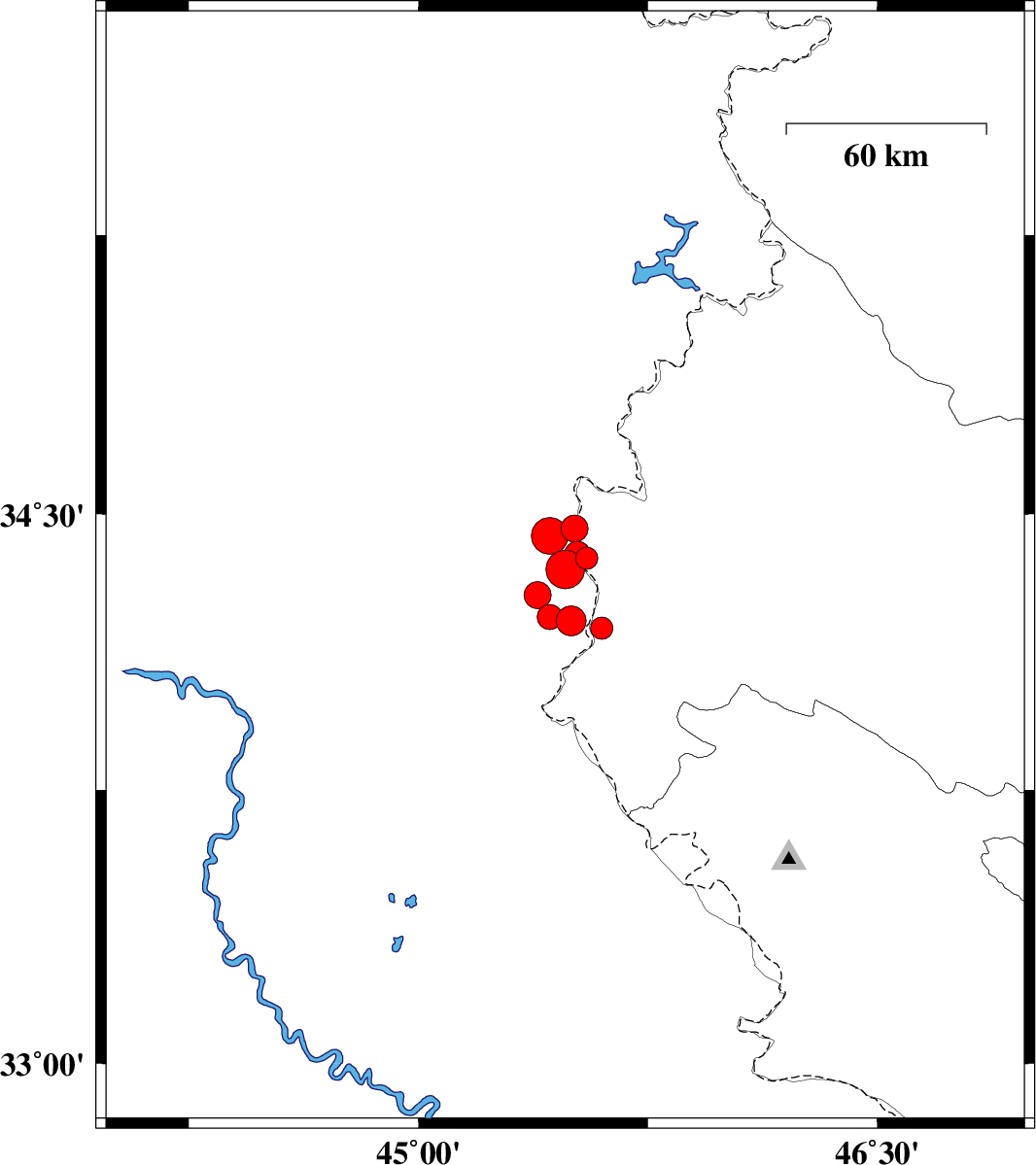 2013/11/22 | 06:51:25.7 | 10:21:25.7 | 34.44 | 45.43 | 14 | ML:5.4 | Iraq, 16 km West of Qasr-E-Shirin |