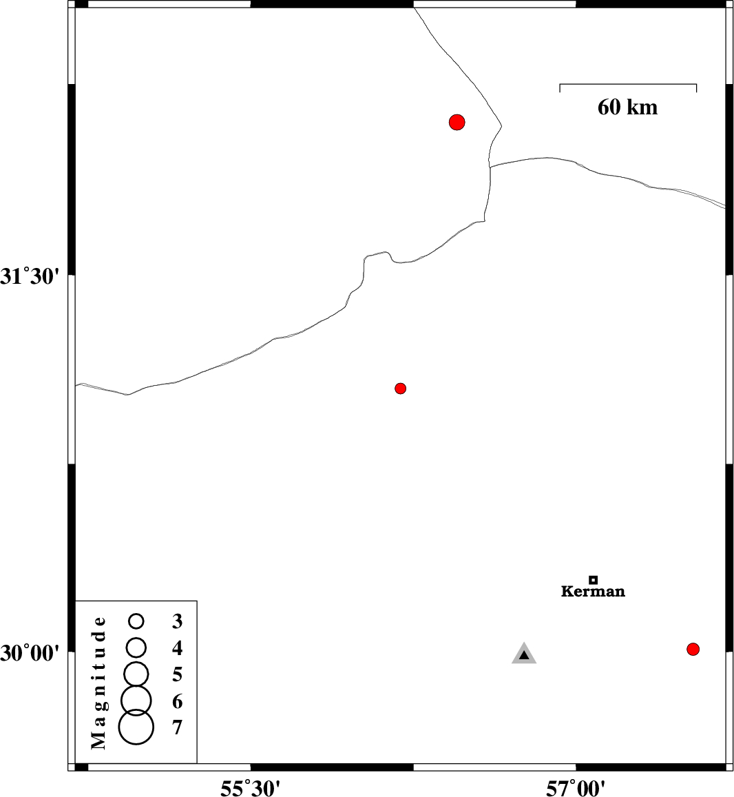 2013/11/18 | 15:27:43.0 | 18:57:43.0 | 30.01 | 57.54 | 14 | ML:2.6 | Kerman Province, 54 km South-East of Kerman |