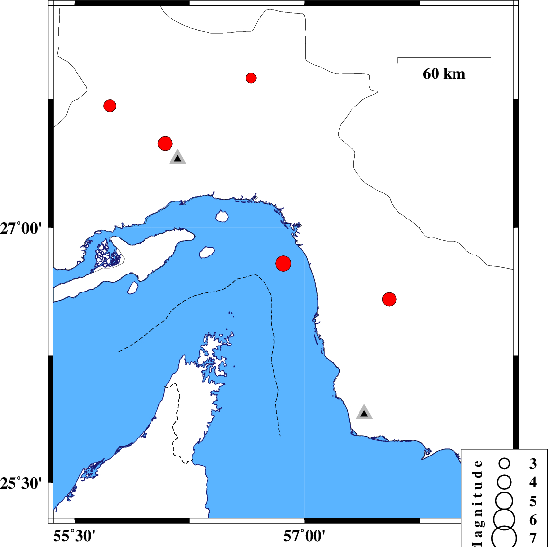 2013/11/07 | 23:38:53.1 | 03:08:53.1 | 26.58 | 57.55 | 42 | ML:3.9 | Hormozgan Province, 92 km South of Manujan | ||