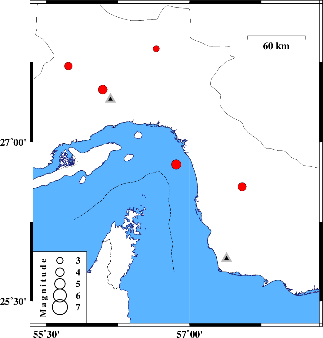 2013/11/20 | 08:20:19.3 | 11:50:19.3 | 27.49 | 56.09 | 15 | ML:4.3 | Hormozgan Province, 39 km North-West of Bandar-e abbas | ||