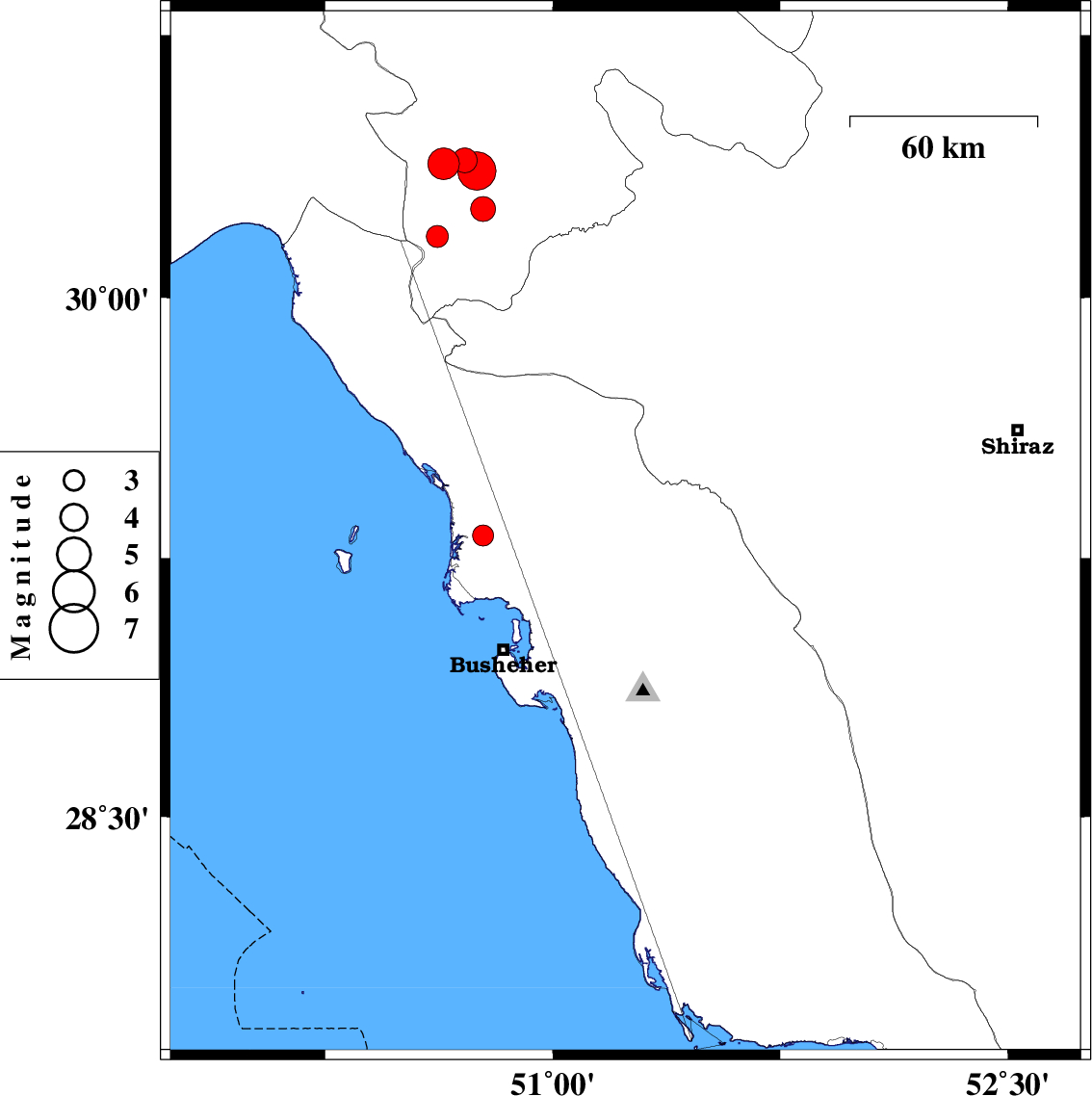 2013/11/28 | 13:51:35.5 | 17:21:35.5 | 29.3 | 51.35 | 15 | ML:5.6 | Bushehr Province, 15 km East of Borazjan | ||