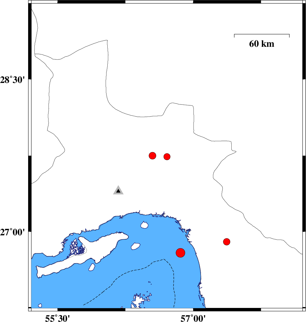 2013/12/01 | 10:14:31.7 | 13:44:31.7 | 26.9 | 57.37 | 14 | ML:3.4 | Hormozgan Province, 40 km South-East of Minab | ||