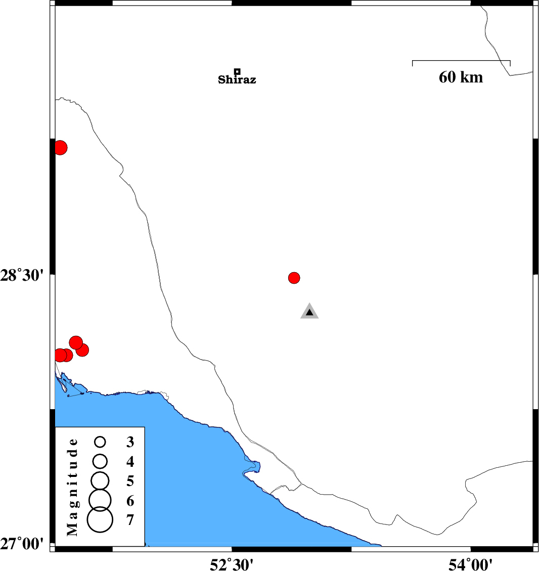 2013/12/06 | 07:43:45.9 | 11:13:45.9 | 28.48 | 52.89 | 15 | ML:3.2 | Fars Province, 14 km West of Qir va Karzin | ||