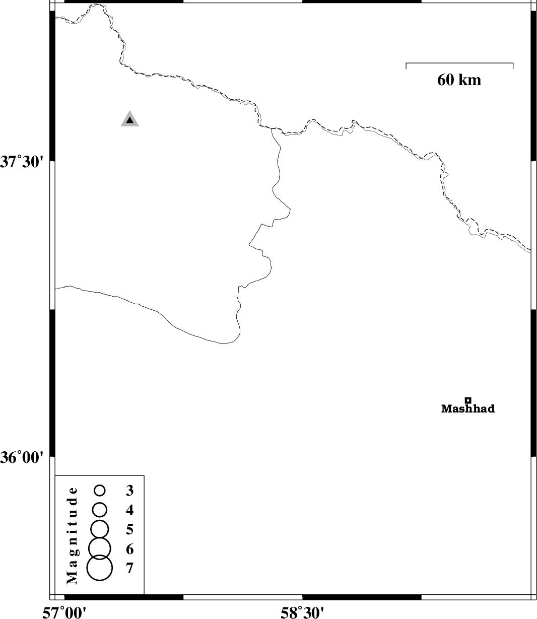 2013/12/07 | 23:12:42.5 | 02:42:42.5 | 36.79 | 58.44 | 14 | ML:4.2 | Khorasan(center) Province, 36 km South of Quchan |