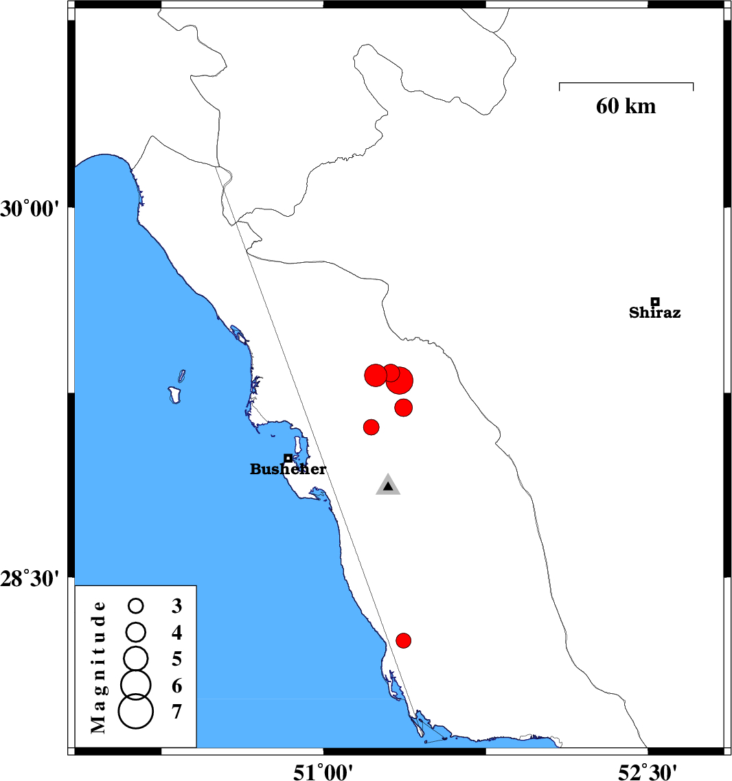 2013/11/28 | 13:51:35.5 | 17:21:35.5 | 29.3 | 51.35 | 15 | ML:5.6 | Bushehr Province, 15 km East of Borazjan | ||