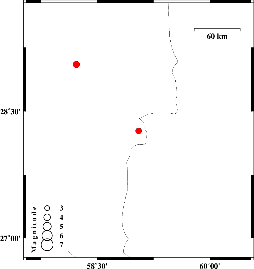 2013/12/17 | 05:19:32.9 | 08:49:32.9 | 28.27 | 59.05 | 18 | ML:3.7 | Kerman Province, 115 km South-East of Bam |