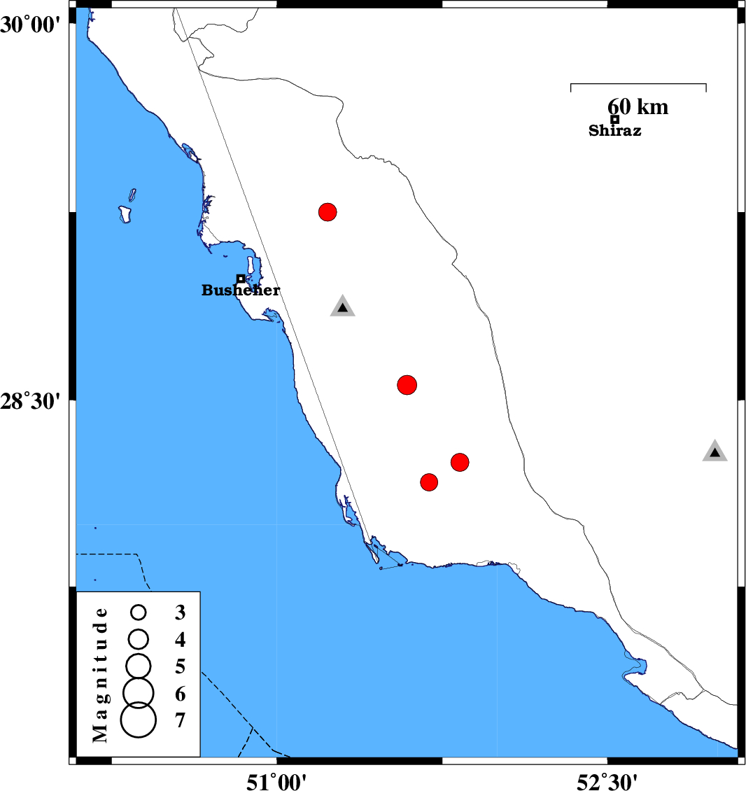 2013/12/18 | 10:59:56.3 | 14:29:56.3 | 29.25 | 51.23 | 6 | ML:3.6 | Bushehr Province, 2 km Borazjan | ||