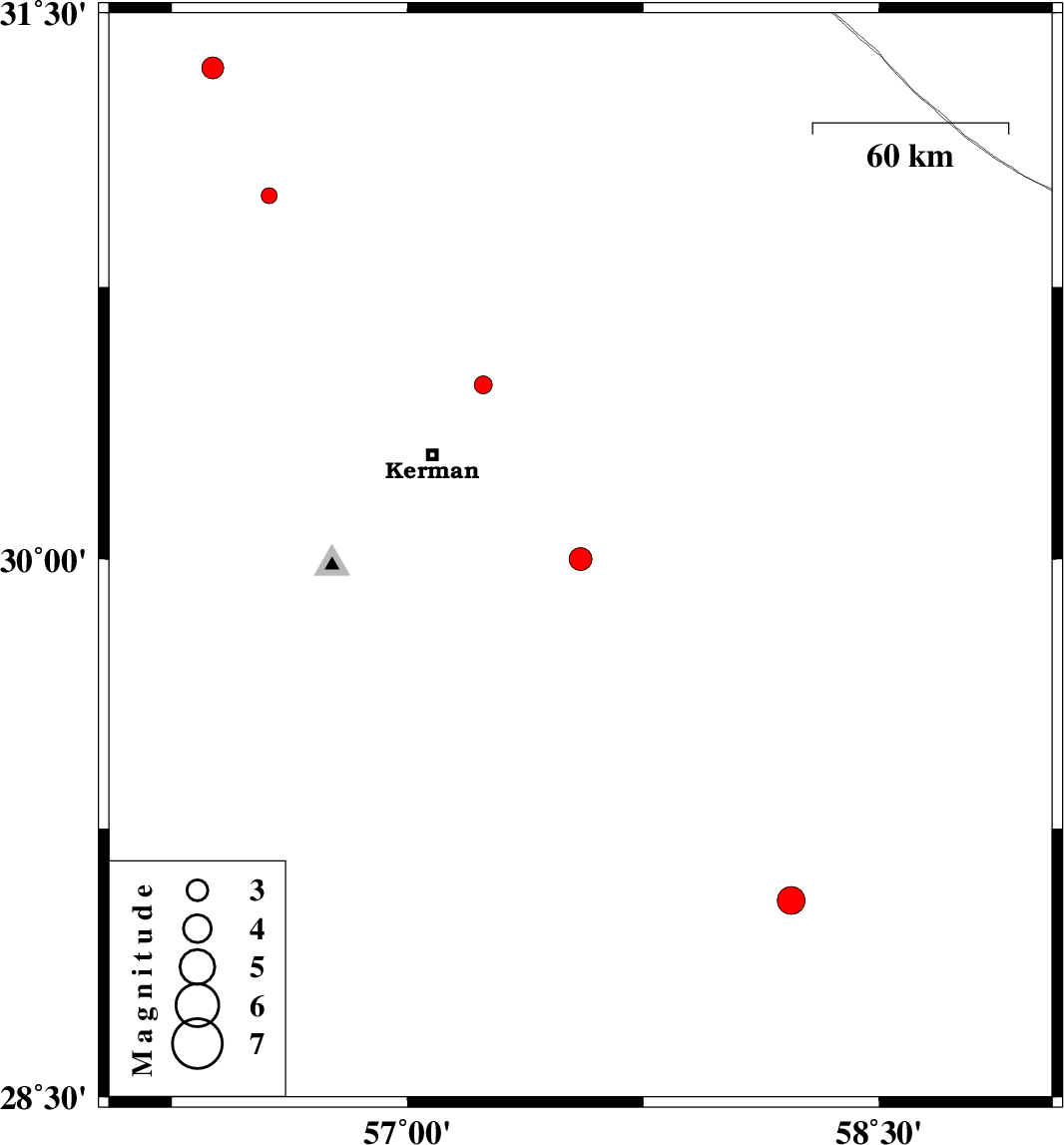 2013/12/17 | 20:07:40.9 | 23:37:40.9 | 29.05 | 58.22 | 15 | ML:3.9 | Kerman Province, 15 km West of Bam | ||