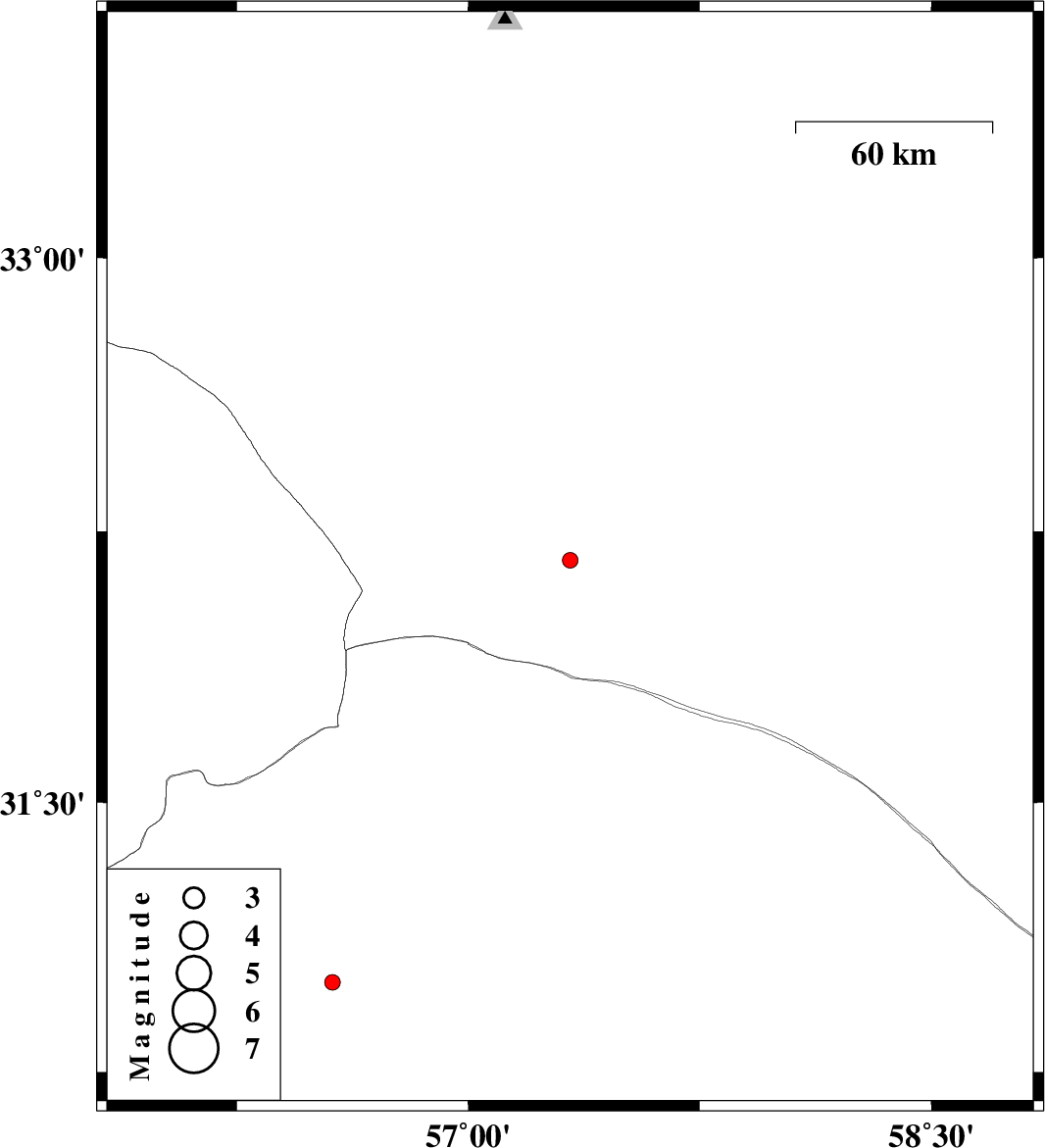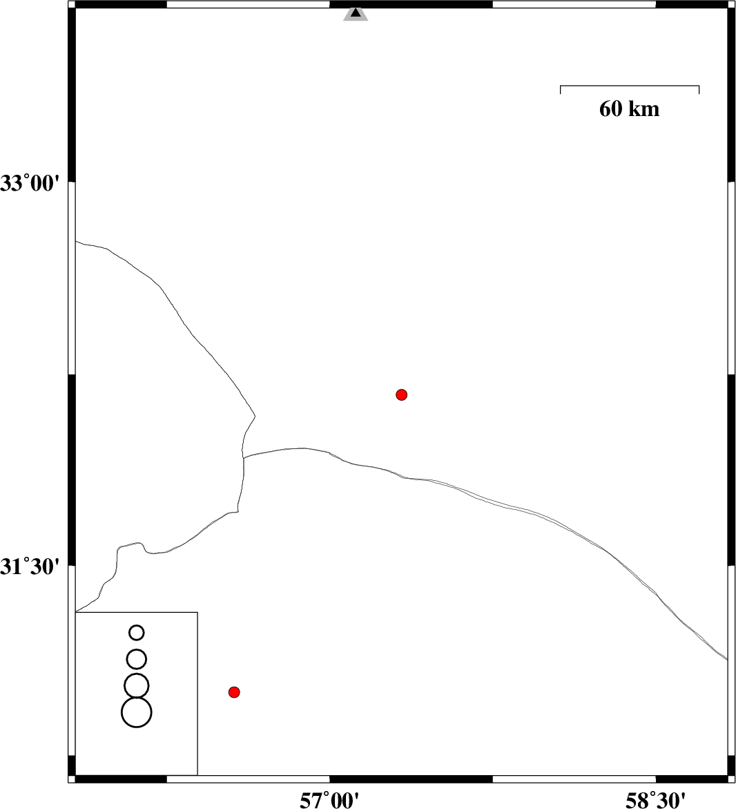 2013/12/25 | 01:36:58.1 | 05:06:58.1 | 32.17 | 57.33 | 14 | ML:2.2 | Yazd Province, 112 km North-East of Ravar | ||