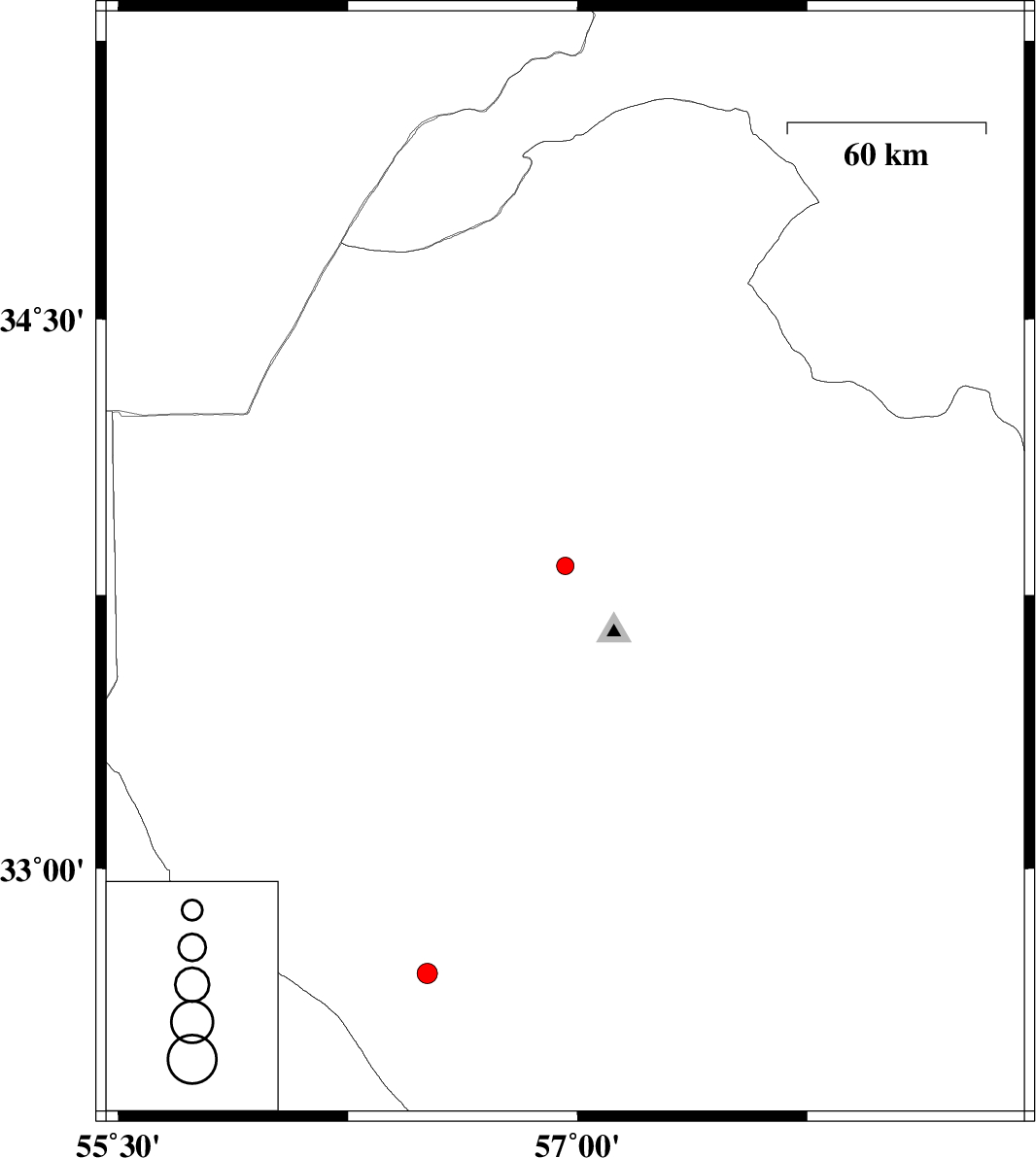 | 2014/01/08 | 18:40:12.3 | 22:10:12.3 | 33.83 | 56.96 | 12 | ML:2.6 | Yazd Province, 25 km North of Tabas | ||