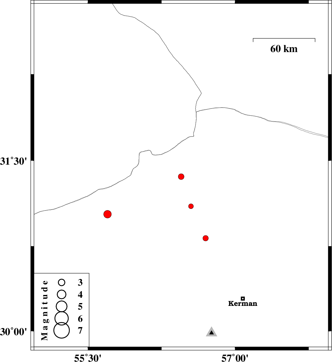 2014/01/12 | 21:47:18.6 | 01:17:18.6 | 30.82 | 56.7 | 14 | ML:2.5 | Kerman Province, 12 km East of Zarand | ||