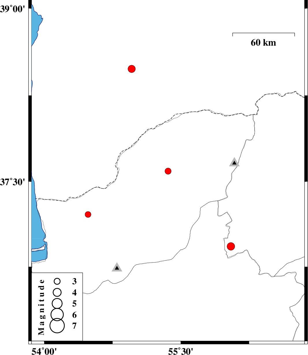 2013/12/28 | 11:34:57.5 | 15:04:57.5 | 36.93 | 56.05 | 27 | ML:3.8 | Khorasan(north) Province, 30 km West of Jajarm |