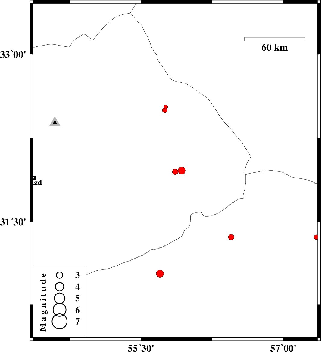 2014/01/20 | 20:34:01.1 | 00:04:01.1 | 32.5 | 55.75 | 37 | ML:2.3 | Yazd Province, 105 km North-East of Bafq | ||