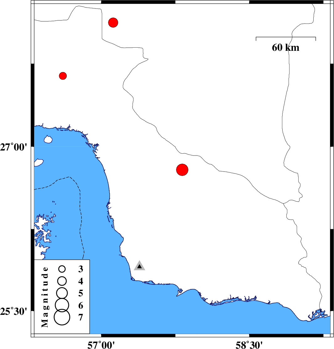 2014/02/02 | 14:26:44.5 | 17:56:44.5 | 26.79 | 57.82 | 15 | Mb:5.3 | Hormozgan Province, 76 km South-East of Manujan | ||