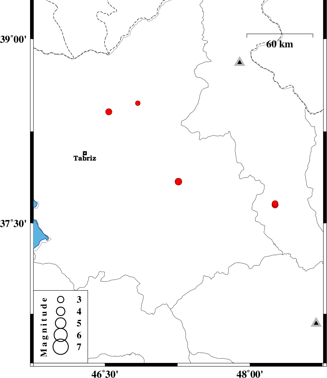 2014/01/27 | 10:39:40.2 | 14:09:40.2 | 38.41 | 46.54 | 14 | ML:3 | Azarbaijan Sharghi Province, 43 km North-East of Tabriz |
