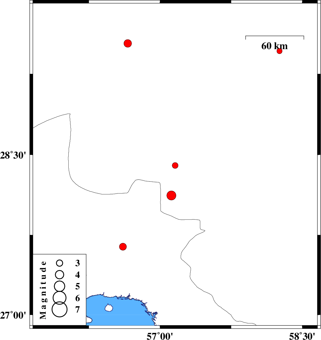 | 2014/02/06 | 11:28:54.5 | 14:58:54.5 | 28.4 | 57.16 | 14 | ML:2.8 | Kerman Province, 64 km South-West of Jiroft | ||