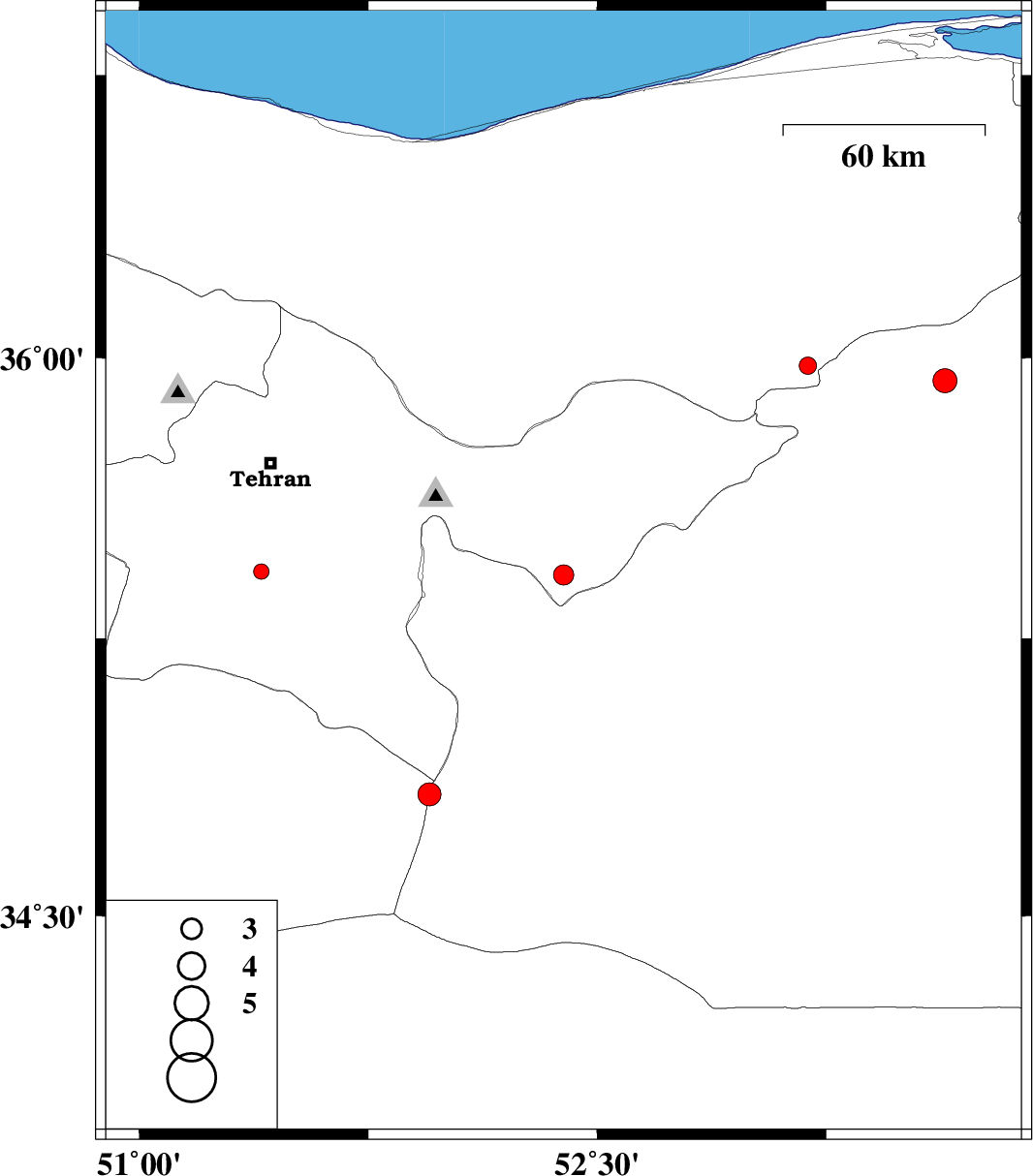 2014/02/17 | 23:34:50.4 | 03:04:50.4 | 35.94 | 53.64 | 14 | ML:3.5 | Semnan Province, 47 km North-East of Semnan | ||