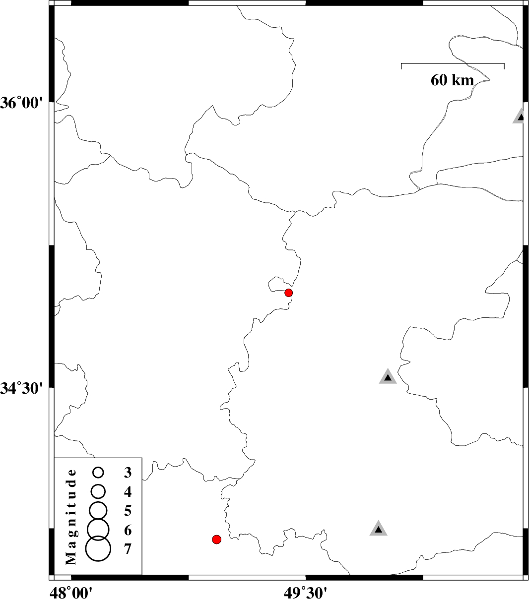 2014/03/02 | 05:50:20.6 | 09:20:20.6 | 33.69 | 48.93 | 15 | ML:2.6 | Lorestan Province, 27 km North-West of Dorud |