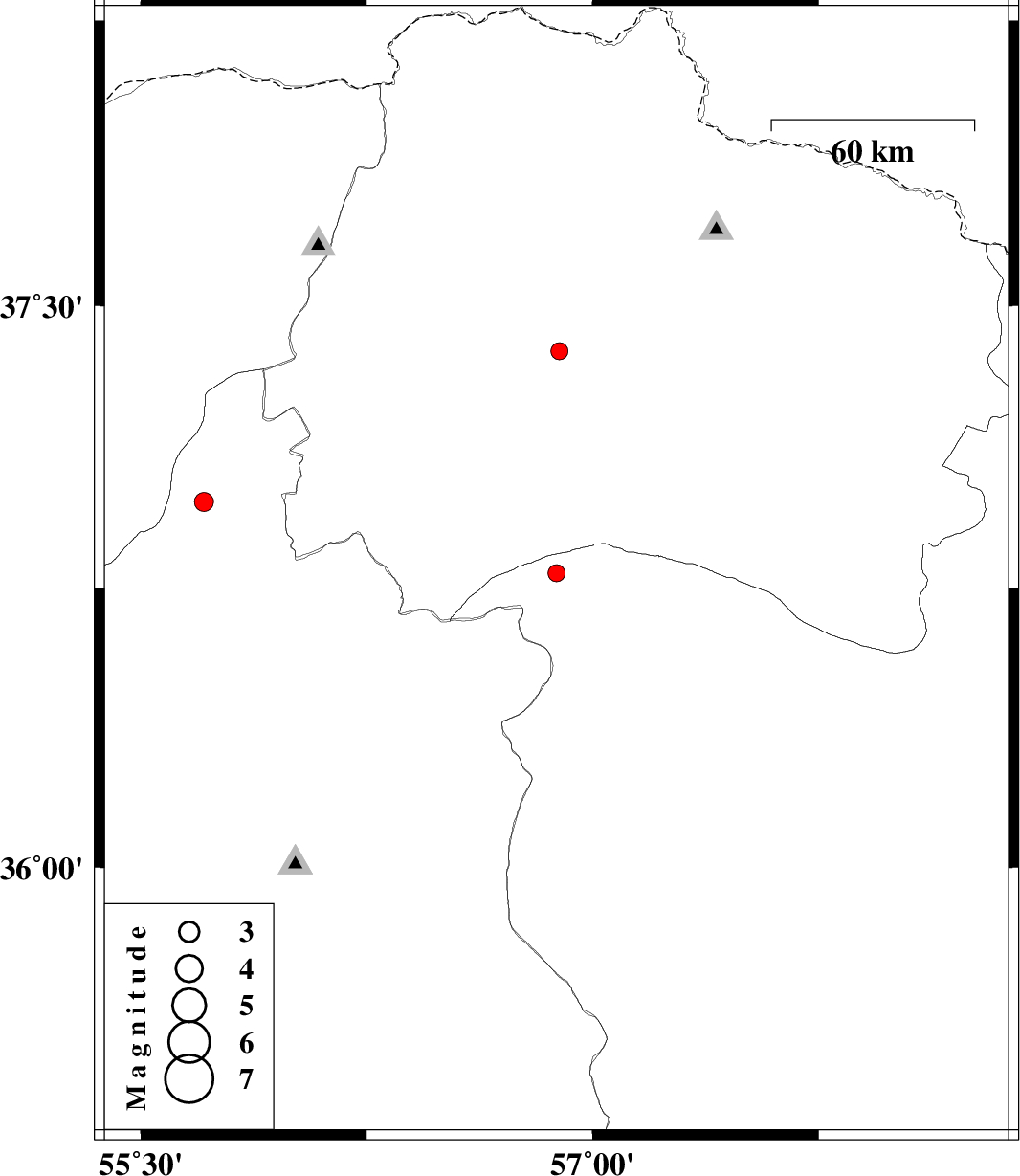 | 2014/03/05 | 05:29:58.0 | 08:59:58.0 | 36.79 | 56.88 | 14 | ML:2.6 | Khorasan(center) Province, 47 km South-East of Jajarm | ||