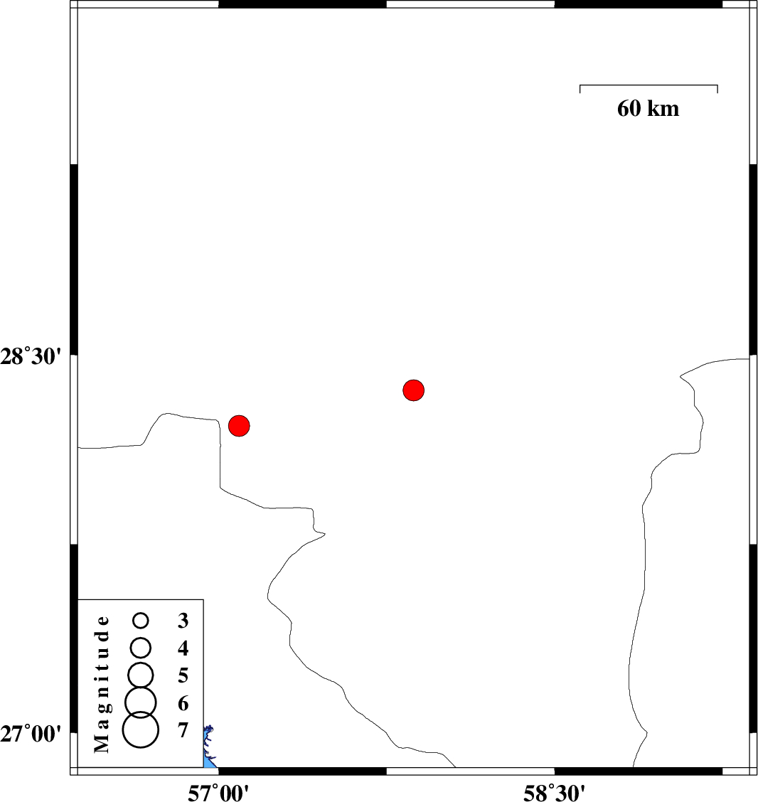 2014/03/12 | 20:22:00.5 | 23:52:00.5 | 28.22 | 57.09 | 14 | ML:4.3 | Kerman Province, 67 km North-West of Kahnuj |