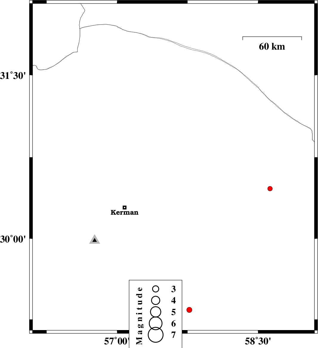 2014/03/30 | 06:45:38.8 | 11:15:38.8 | 29.53 | 56.74 | 12 | ML:2.5 | Kerman Province, 35 km North-East of Baft |