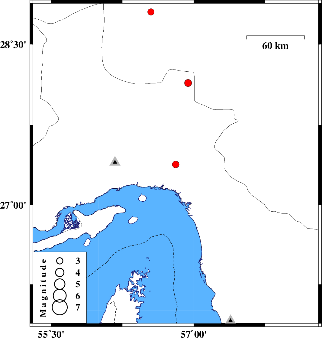 2014/04/12 | 06:02:18.9 | 10:32:18.9 | 27.38 | 56.81 | 15 | ML:3.3 | Hormozgan Province, 43 km West of Dehbarez | ||