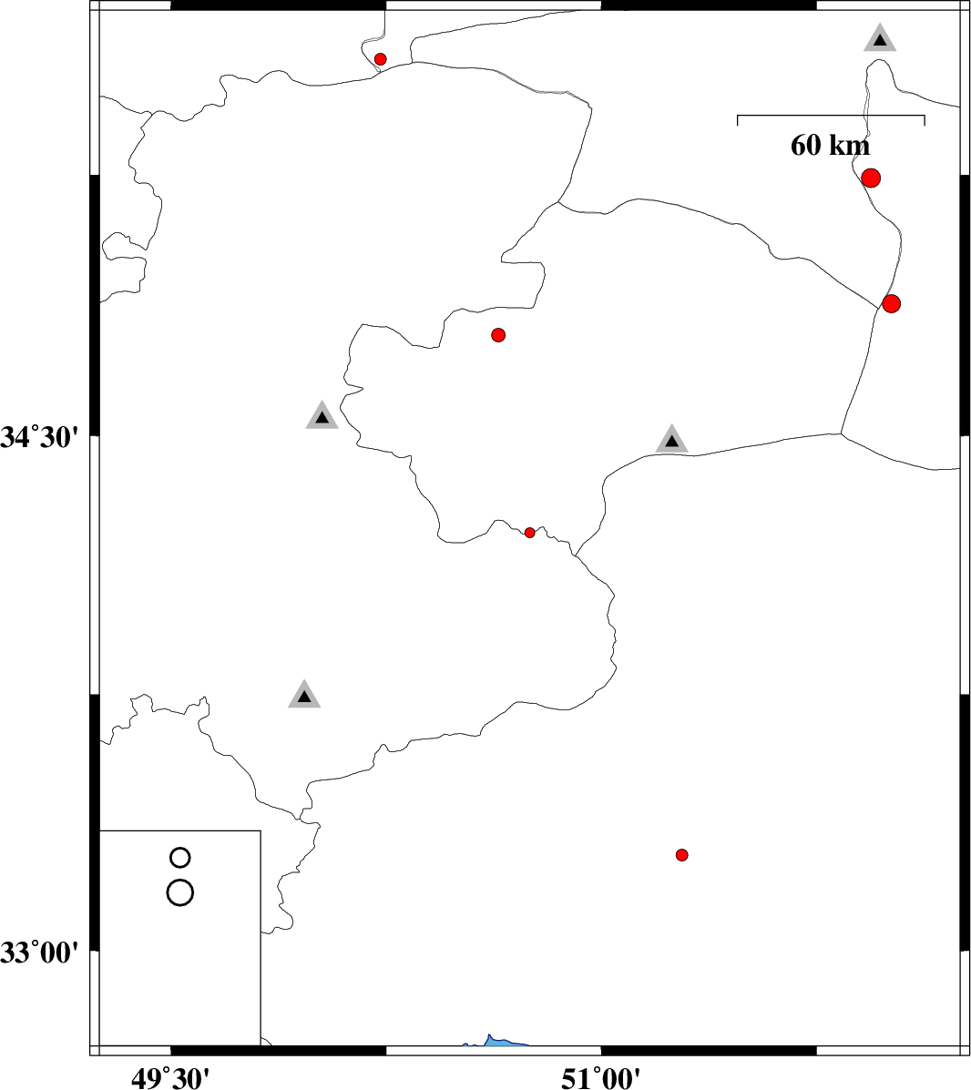 2014/03/27 | 01:09:18.6 | 05:39:18.6 | 33.28 | 51.28 | 18 | ML:1.9 | Esfahan Province, 66 km North-East of Tiran | ||