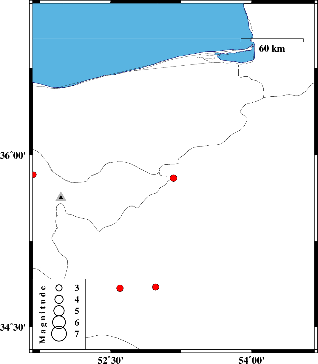 2014/04/15 | 03:42:34.1 | 08:12:34.1 | 34.85 | 52.98 | 14 | ML:3.1 | Semnan Province, 71 km South-East of Garmsar | ||