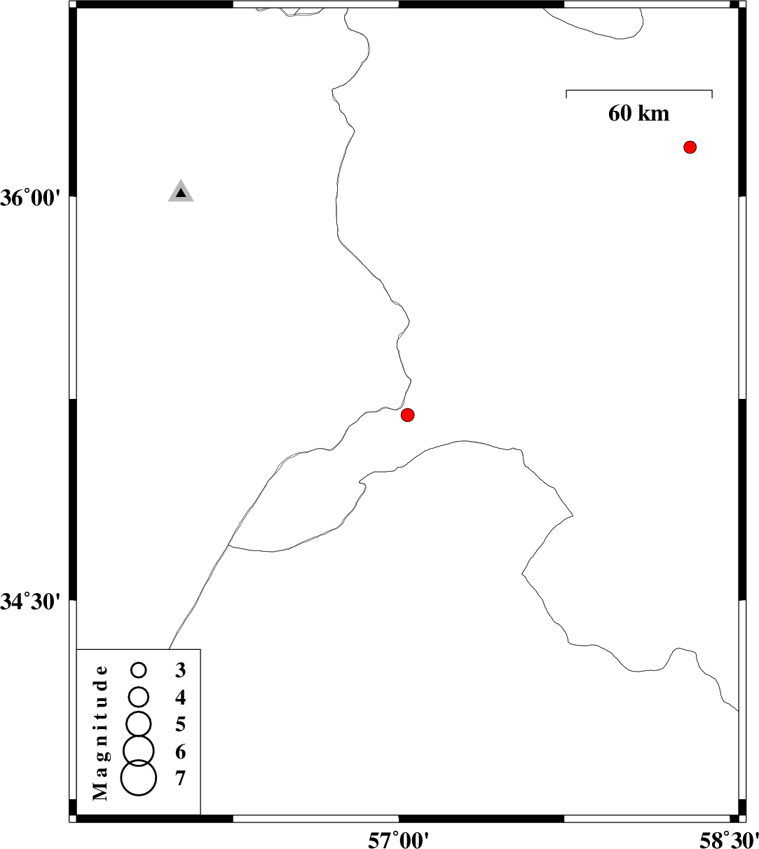 2014/04/01 | 02:58:42.6 | 07:28:42.6 | 36.18 | 58.32 | 15 | ML:2.5 | Khorasan(center) Province, 43 km West of Neyshabur |