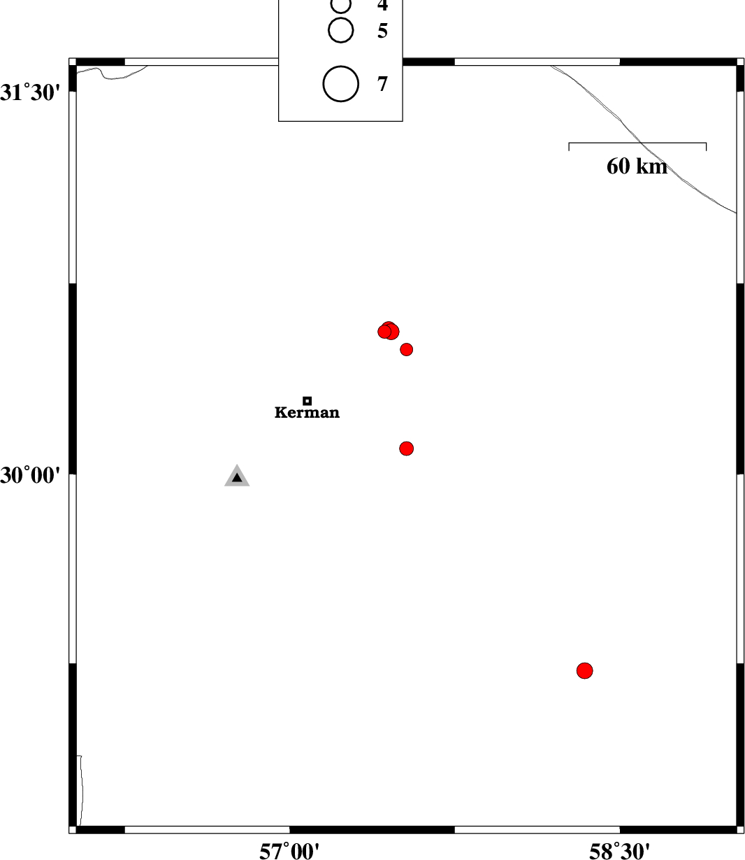 2014/04/29 | 04:57:59.3 | 09:27:59.3 | 30.1 | 57.53 | 18 | ML:2.8 | Kerman Province, 48 km South-East of Kerman | ||