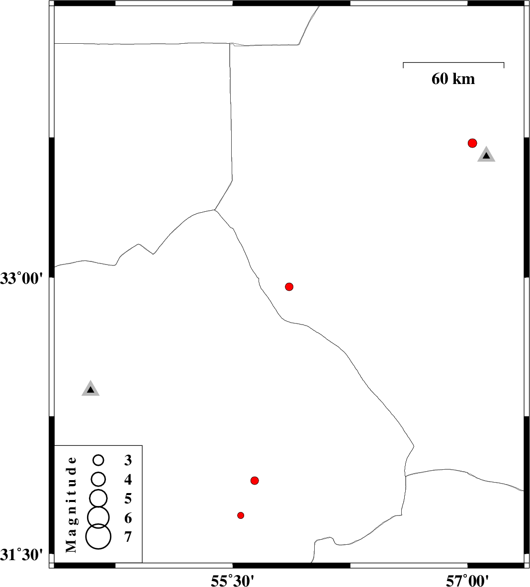 2014/05/05 | 18:19:31.3 | 22:49:31.3 | 32.95 | 55.86 | 14 | ML:2.3 | Yazd Province, 123 km South-West of Tabas | ||