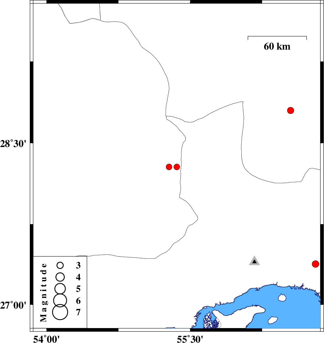 2014/04/12 | 06:02:18.9 | 10:32:18.9 | 27.38 | 56.81 | 15 | ML:3.3 | Hormozgan Province, 43 km West of Dehbarez | ||