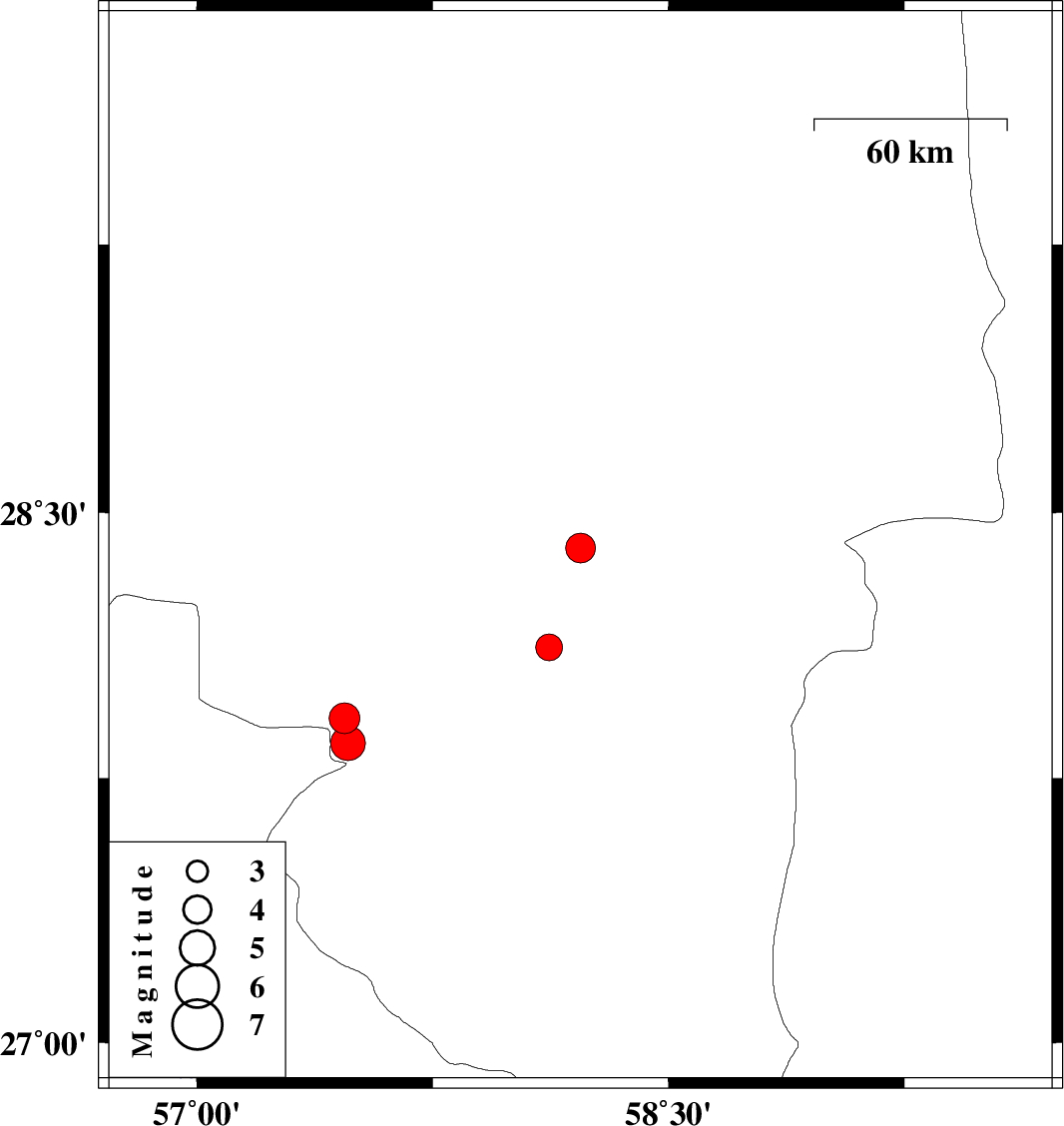 2014/05/09 | 00:08:43.7 | 04:38:43.7 | 27.85 | 57.48 | 14 | ML:4.9 | Kerman Province, 24 km South-West of Kahnuj | ||