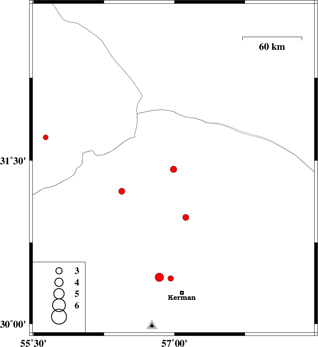 2014/05/12 | 16:03:19.1 | 20:33:19.1 | 30.42 | 56.96 | 14 | ML:2.7 | Kerman Province, 19 km North-West of Kerman | ||