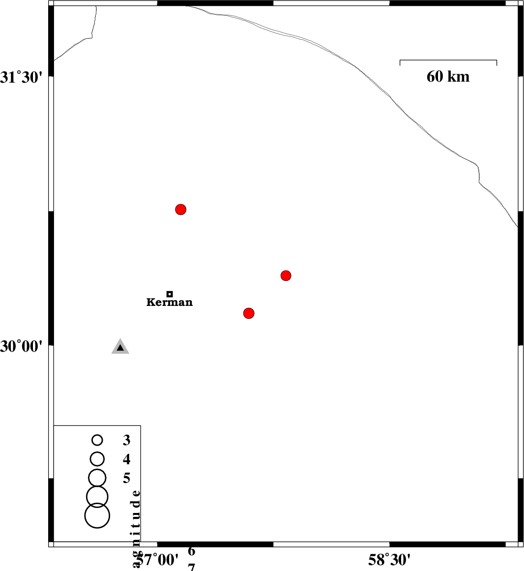 2014/05/28 | 21:15:34.5 | 01:45:34.5 | 30.39 | 57.83 | 18 | ML:2.9 | Kerman Province, 73 km North-East of Kerman | ||