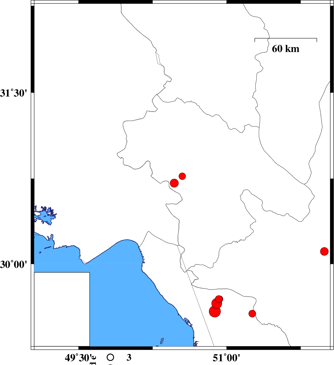 2014/05/23 | 05:26:48.4 | 09:56:48.4 | 29.69 | 50.92 | 14 | ML:3.3 | Bushehr Province, 42 km North-East of Bandar-e genaveh | ||