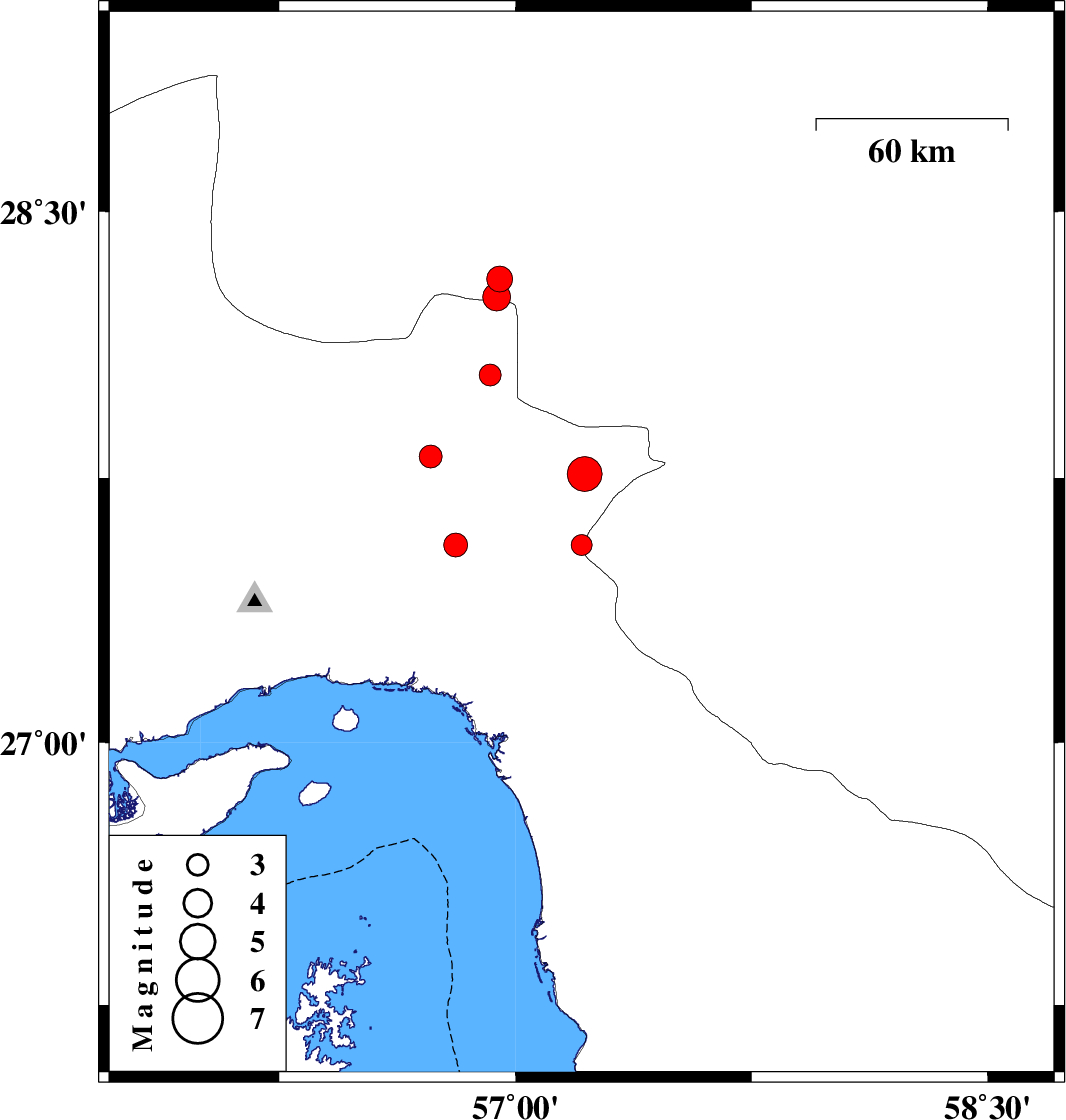 2014/06/11 | 06:06:33.0 | 10:36:33.0 | 28.26 | 56.94 | 14 | ML:3.9 | Kerman Province, 81 km North-West of Kahnuj | ||