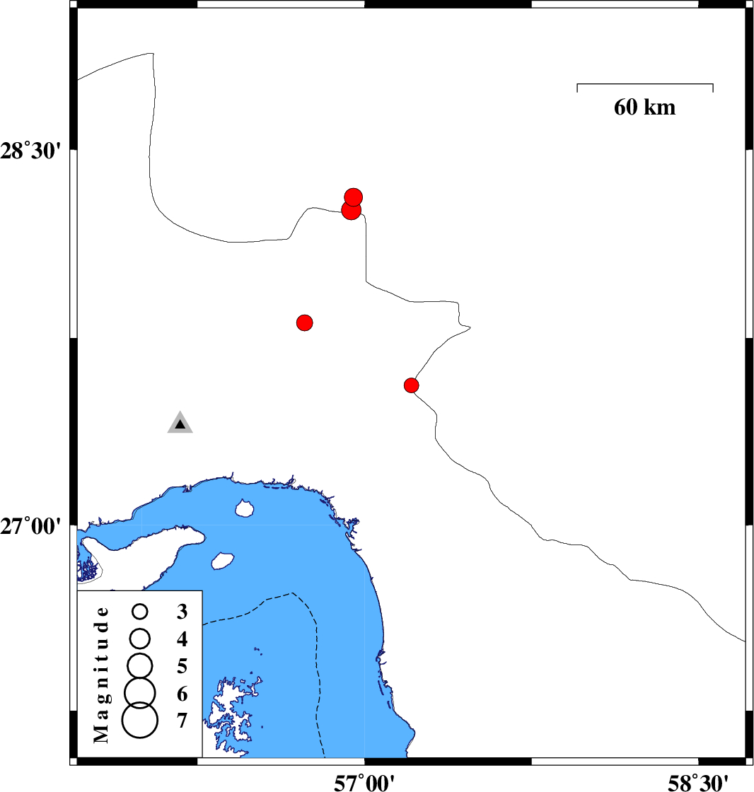 2014/06/11 | 06:06:33.0 | 10:36:33.0 | 28.26 | 56.94 | 14 | ML:3.9 | Kerman Province, 81 km North-West of Kahnuj |