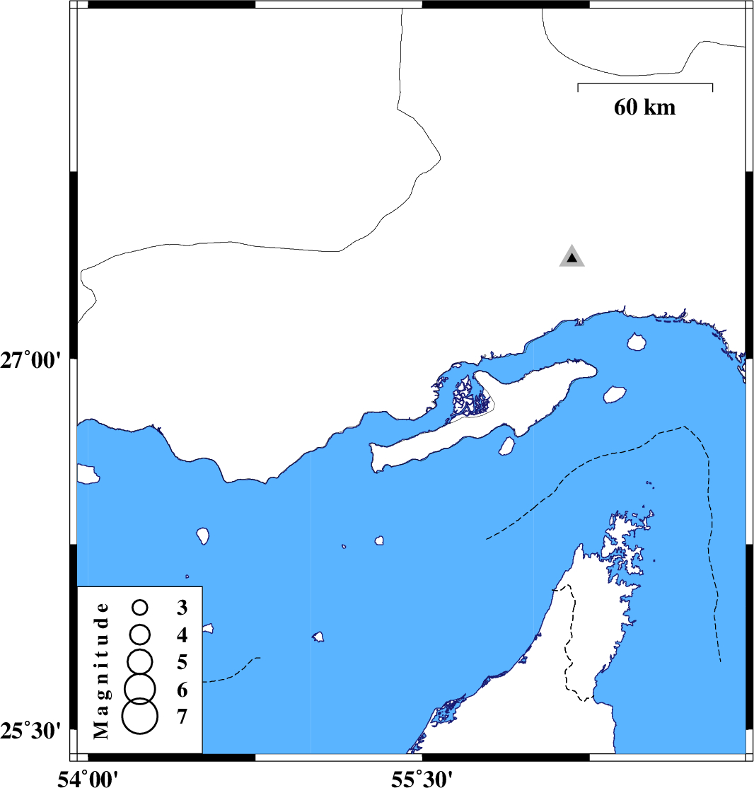 2014/07/03 | 04:20:01.1 | 08:50:01.1 | 26.9 | 55.45 | 9 | ML:3.9 | Hormozgan Province, 81 km West of Qeshm |