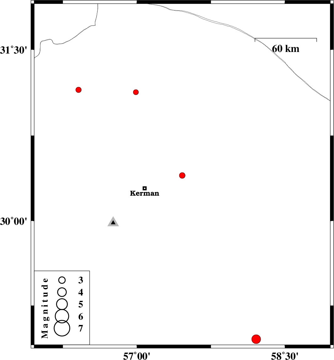 2014/07/07 | 18:39:54.9 | 23:09:54.9 | 30.4 | 57.46 | 14 | ML:2.7 | Kerman Province, 38 km North-East of Kerman | ||