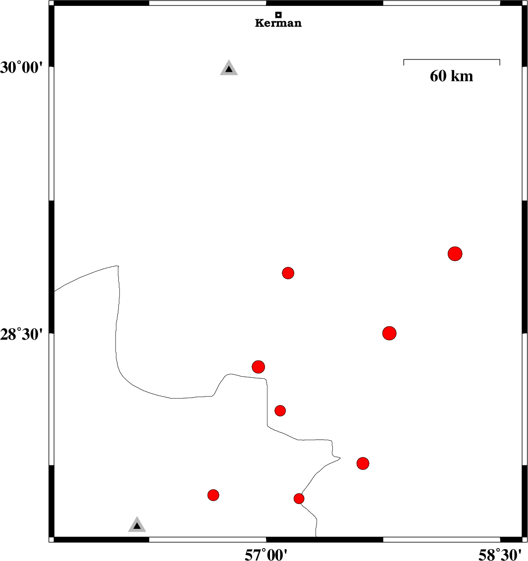 2014/06/23 | 04:21:16.7 | 08:51:16.7 | 28.5 | 57.79 | 14 | ML:4 | Kerman Province, 19 km South of Jiroft | ||