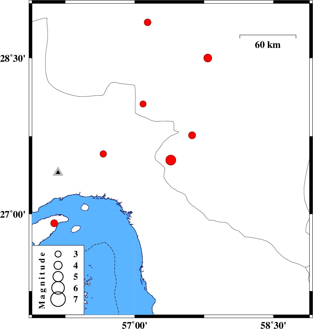 2014/06/25 | 14:20:11.1 | 18:50:11.1 | 27.76 | 57.62 | 14 | ML:3.5 | Kerman Province, 22 km South of Kahnuj | ||