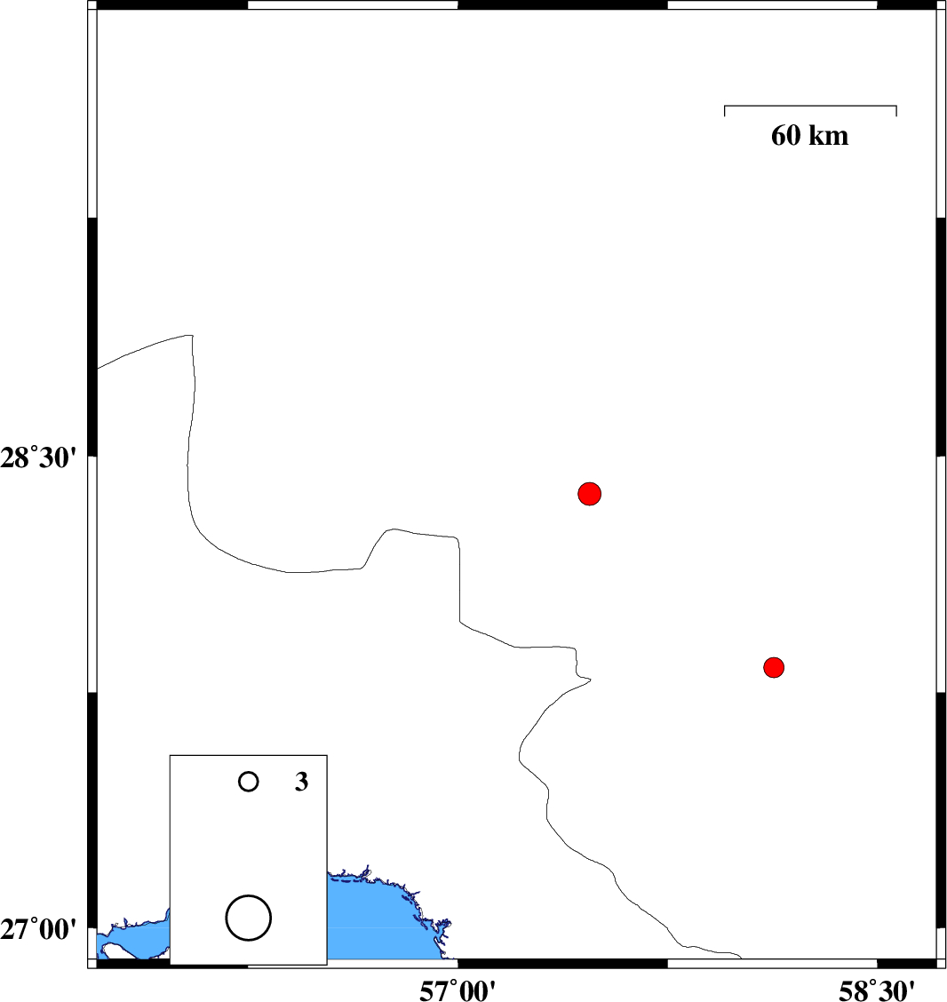 2014/08/06 | 15:55:32.8 | 20:25:32.8 | 28.4 | 57.21 | 29 | ML:3.6 | Kerman Province, 59 km South-West of Jiroft | ||