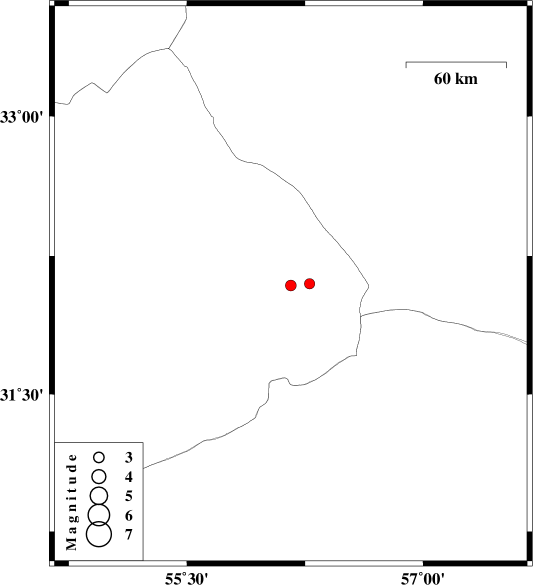 2014/08/07 | 10:30:55.6 | 15:00:55.6 | 32.09 | 56.16 | 14 | ML:3.1 | Yazd Province, 90 km North-East of Bafq | ||