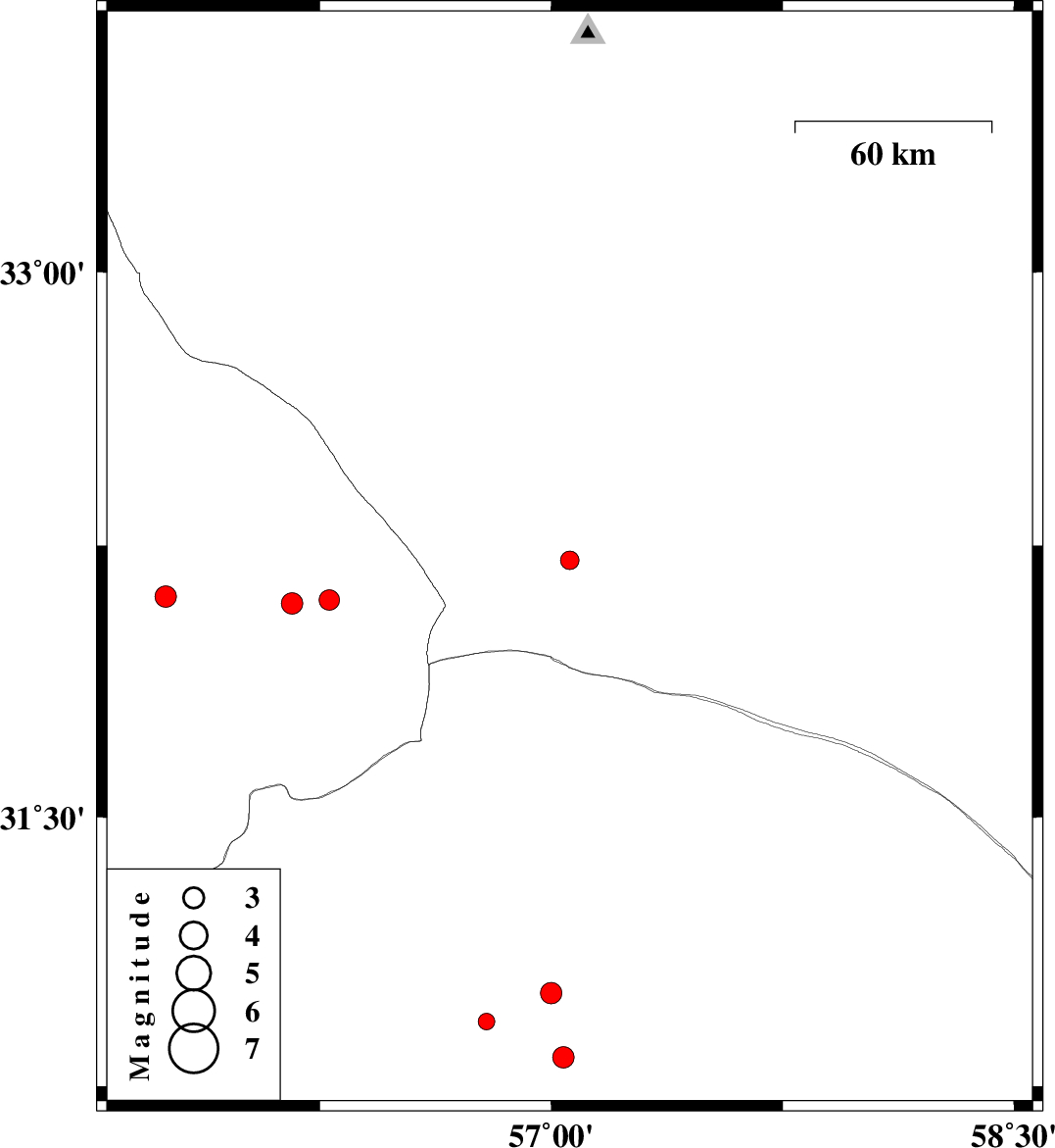 2014/08/07 | 10:30:55.6 | 15:00:55.6 | 32.09 | 56.16 | 14 | ML:3.1 | Yazd Province, 90 km North-East of Bafq | ||