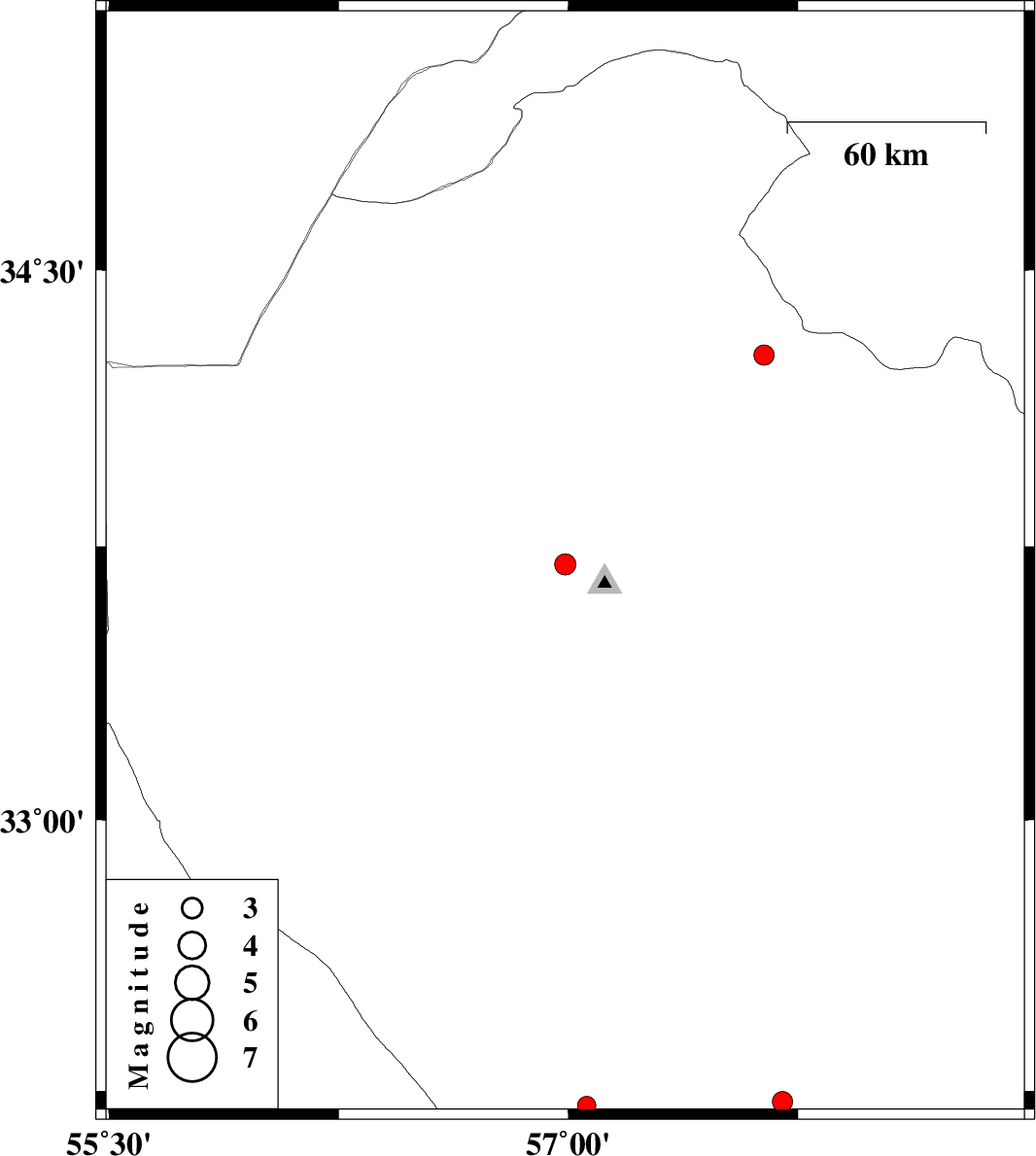 2014/08/05 | 22:10:04.8 | 02:40:04.8 | 34.27 | 57.64 | 30 | ML:2.9 | Khorasan(center) Province, 58 km North-West of Ferdows |