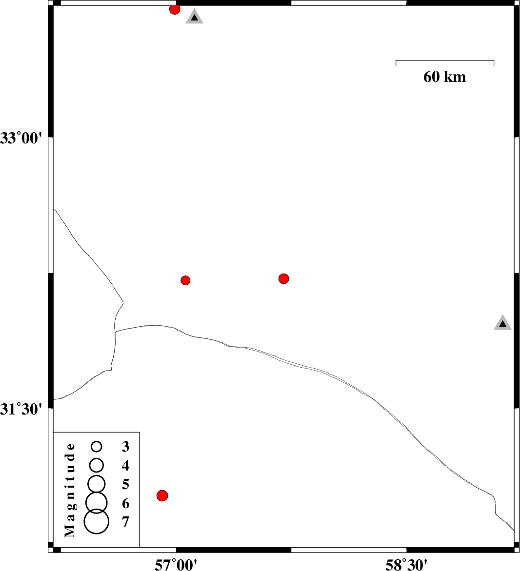 2014/08/17 | 00:07:44.7 | 04:37:44.7 | 31.01 | 56.91 | 18 | ML:3.2 | Kerman Province, 30 km South-East of Ravar | ||