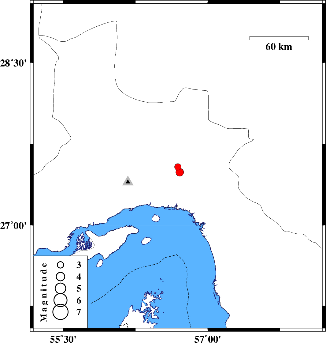2014/09/12 | 00:57:52.0 | 05:27:52.0 | 27.54 | 56.69 | 28 | ML:3.1 | Hormozgan Province, 56 km North-West of Dehbarez | ||