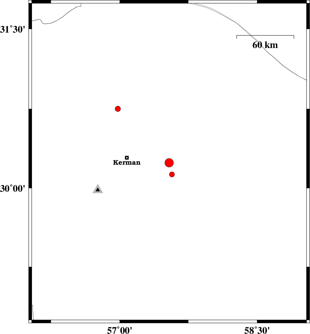 2014/09/16 | 19:38:56.8 | 00:08:56.8 | 30.13 | 57.57 | 16 | ML:2.6 | Kerman Province, 51 km South-East of Kerman | ||