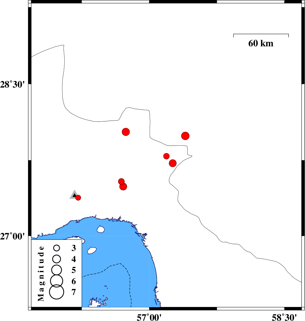 2014/09/12 | 00:57:52.0 | 05:27:52.0 | 27.54 | 56.69 | 28 | ML:3.1 | Hormozgan Province, 56 km North-West of Dehbarez | ||